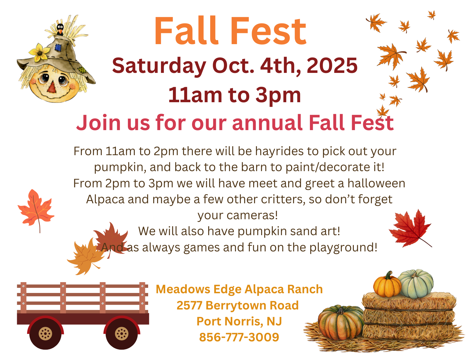 Join us for our annual Fall Fest. We will have hay rides 11am to 2pm to pick your pumpkin and back to the barn for decorating/painting. From 2pm to 3pm will be meet and greet a Halloween Alpaca and maybe a few other critters. As always we will have kids craft and games and fun on the playground.